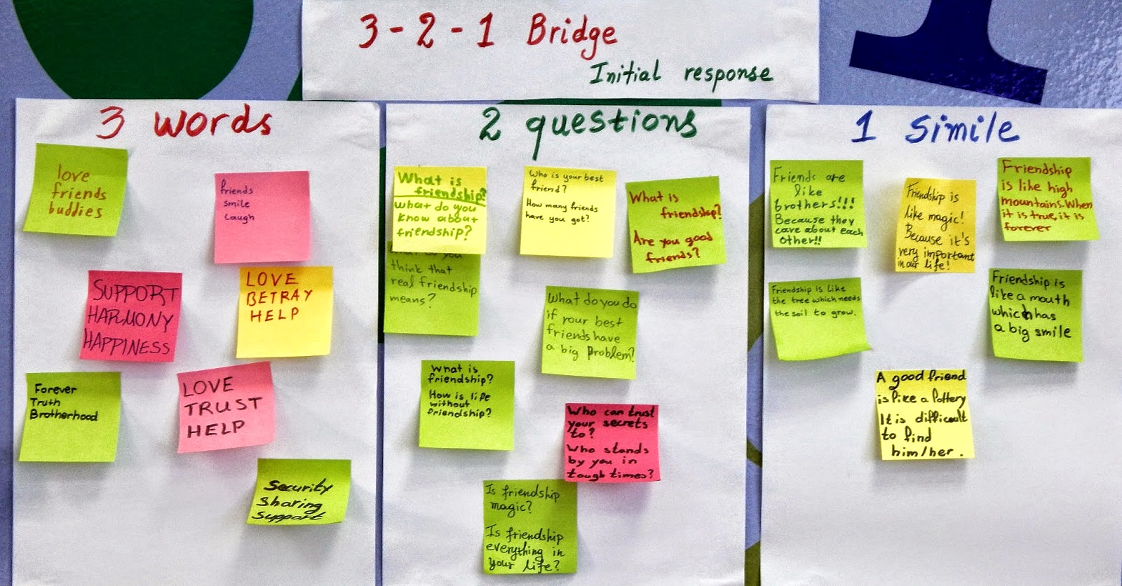 Go back to step 2 and to the 3-2-1 Bridge routine. Ask students to write: 3 words, 2 questions and 1 simile when they think about friendship.