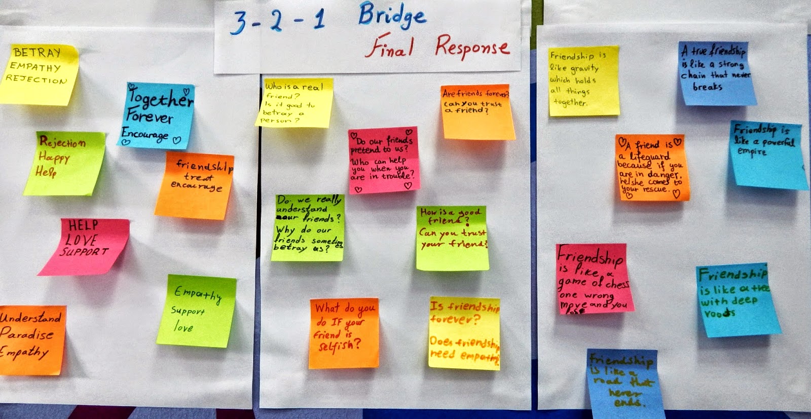 In my classroom practice the instructional period involved: a set of questions for students to reflect upon and respond, an extract from a poem, a extract from a short story and a short animation film. It was really interesting how after reading, watching and discussing, new thoughts and ideas came to the fore. Students' final response to the 3-2-1 Bridge revealed a more extended use of the notions of judging, rejection, weakness, betrayal, jealousy and selfishness when we think about friendship than in their initial responses. These notions may have to do with many different issues, but some of the ones students thought are important were: appearance, disability, coming from another country, being a very good or a bad student. As one student wrote in her final remarks: